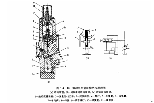 為液壓阪動(伺服)變量機構(gòu)。又稱壓力補償變量機構(gòu),其機構(gòu)原理如圖3.4-10所示,其中伺服閥芯3與差動變量活塞1掬成伺服滑倒。差動變量活與變量殼(缸)體2掏成主牽動液壓缸。