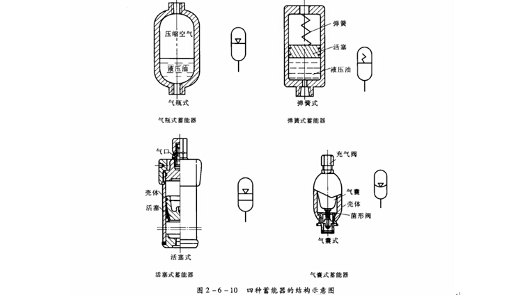 除彈簧式外,它們都是先通過充氣閥向氣囊或氣缸內(nèi)充入一定壓力的氣體,充氣后將充氣閥關(guān)閉,使氣體被封閉在氣囊或氣缸內(nèi)。工作時(shí),油液從蓄能器下部的液壓油人口進(jìn)入蓄能器,壓縮氣體直至達(dá)到平衡,這樣在蓄能器氣囊或氣缸下方的腔體內(nèi)就儲存了一定壓力的液壓油。其他的蓄能器的工作原理類似。
