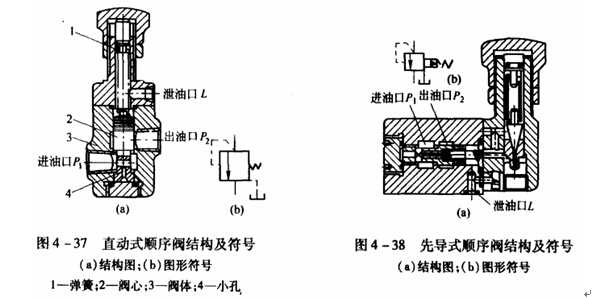 (2)先導(dǎo)式順序閥。圖4-38表示先導(dǎo)式順序閥結(jié)構(gòu)及符號。它的結(jié)構(gòu)與先導(dǎo)式溢流閥的結(jié)構(gòu)基本相同。但先導(dǎo)式順序閥來用單獨的泄油口L。它的工作原理是當(dāng)進(jìn)油油口(團中未標(biāo))通入壓力油,其液壓力超過彈簧力,使進(jìn)出油口相通,操縱另一級執(zhí)行元件動作。