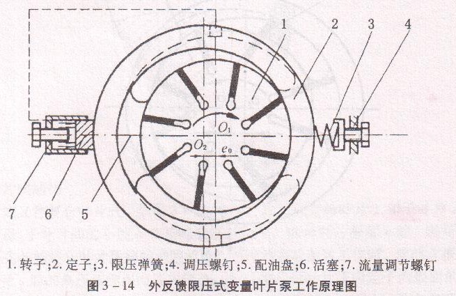 單作用式葉片泵的變量方法是改變其偏心距e的大小,偏心距可通過手動調節(jié),也可自動調節(jié)。自動調節(jié)的變量泵可根據其工作特性的不同分為限壓式、恒壓式和恒流量式三類,其中以限壓式應用較多。