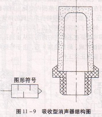 圖11 -9為四柱油壓機(jī)吸收型消聲器結(jié)構(gòu)圖。當(dāng)氣流通過(guò)由聚苯乙烯顆;蜚~珠燒結(jié)而成的消聲罩時(shí),氣流與消聲材料的細(xì)孔相摩擦,聲能量被部分吸收轉(zhuǎn)化為熱能,從而降低了噪聲強(qiáng)度。這種消聲器可良好地消除中、高頻噪聲。